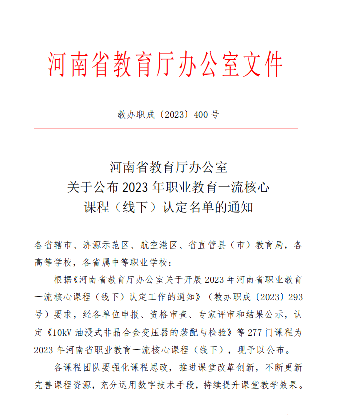 近日,河南省教育厅下发了《河南省教育厅办公室关于公布2023年职业教育一流核心课程(线下)认定名单的通知(教办职成〔2023〕400号),9428cn太阳集团张昭晗教师团队的《自动化生产线集成与应用》课程被认定为河南省职业教育一流核心课程。